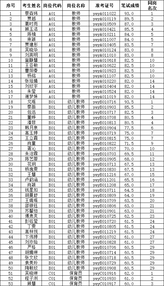 盐城幼专附属幼儿园2025年公开招聘(录)工作人员拟进入面试人员名单(A01岗位、B01岗位、C01岗位)