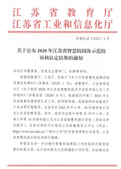 2021年1月,我校被江苏省教育厅、江苏省工业和信息化厅联合审核评定为江苏省智慧校园。这既是对我校进