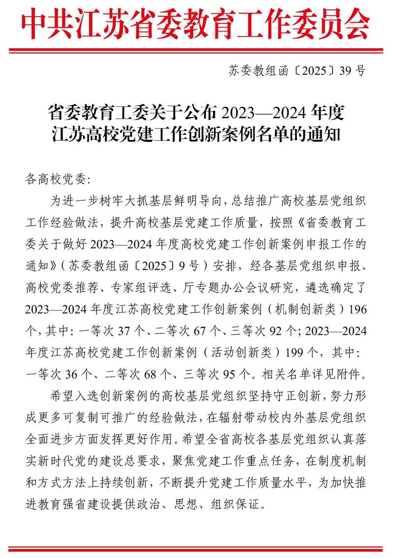 我校两项成果获评2023—2024年度江苏高校党建工作创新案例