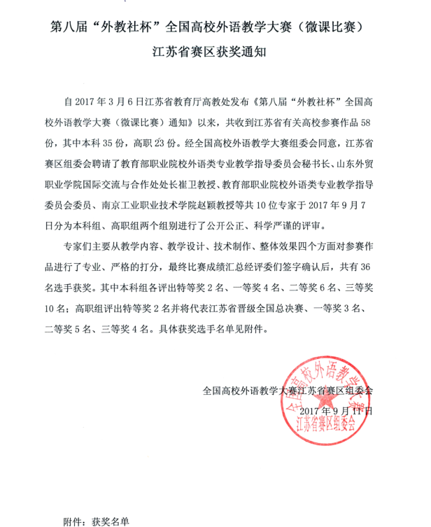 金秋九月,硕果累累,捷报频传!在2017年江苏省教育厅高教处组织的《第八届“外教社杯&r