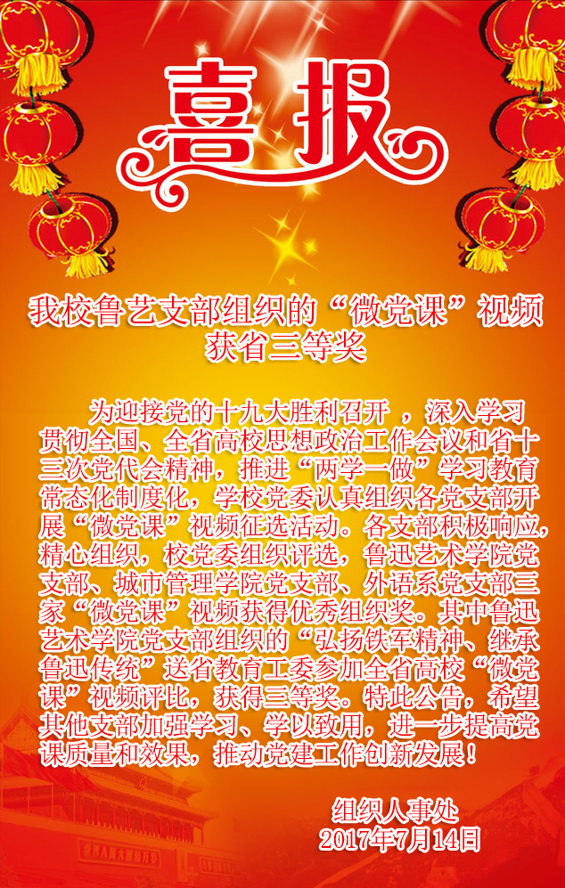 喜报:我校鲁艺支部组织的“微党课”视频获省三等奖