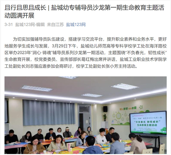 盐城123网:且行且思且成长 | 盐城幼专辅导员沙龙第一期生命教育主题活动圆满开展