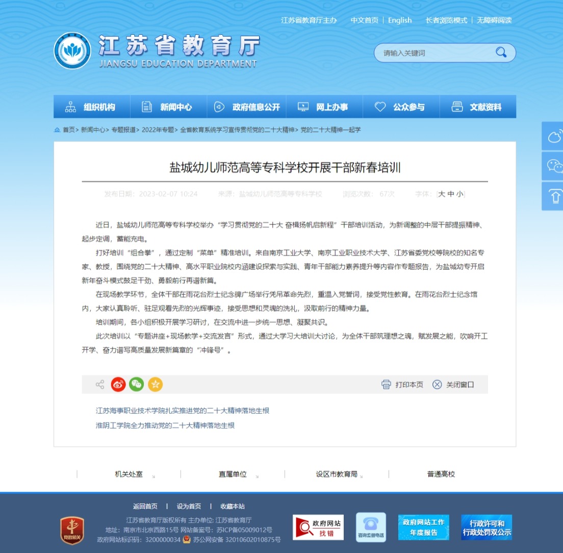 江苏省教育厅:盐城幼儿师范高等专科学校开展干部新春培训