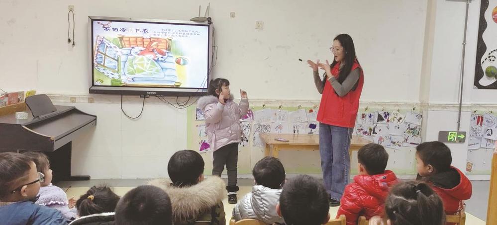 “阅享童年”志愿者老师和孩子们一起做游戏。 盐城晚报讯 为激发和引