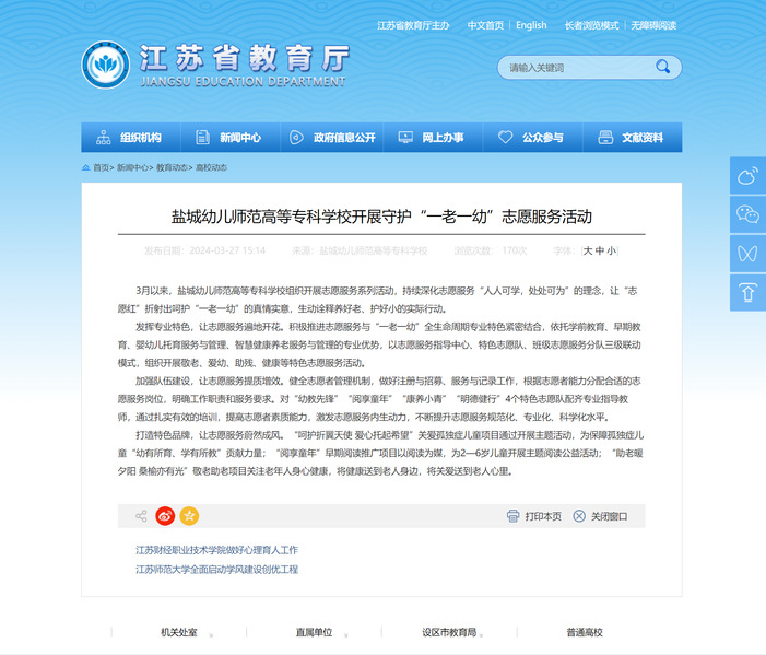 江苏省教育厅:盐城幼儿师范高等专科学校开展守护“一老一幼”志愿服务活动