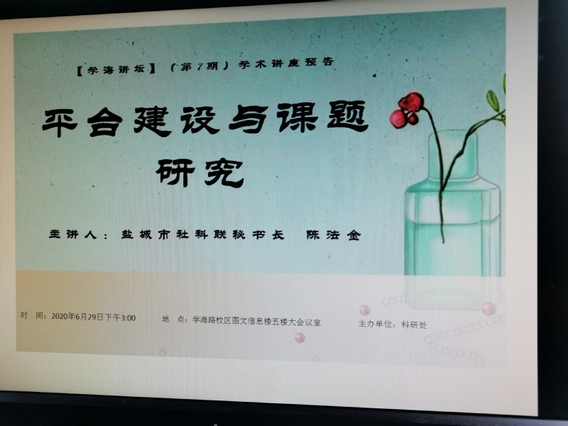 2020年6月29日下午,应我校科研处的邀请,盐城市社科联陈法金秘书长在我校学海路校区图文信息楼五楼大会议室,做了题为《平台建设与课题研究》的学术讲座。本次讲座由科研处处长周梅香主持,来自各二级学院分管科研工作的院长、校级科研平台负责人及成员和部...